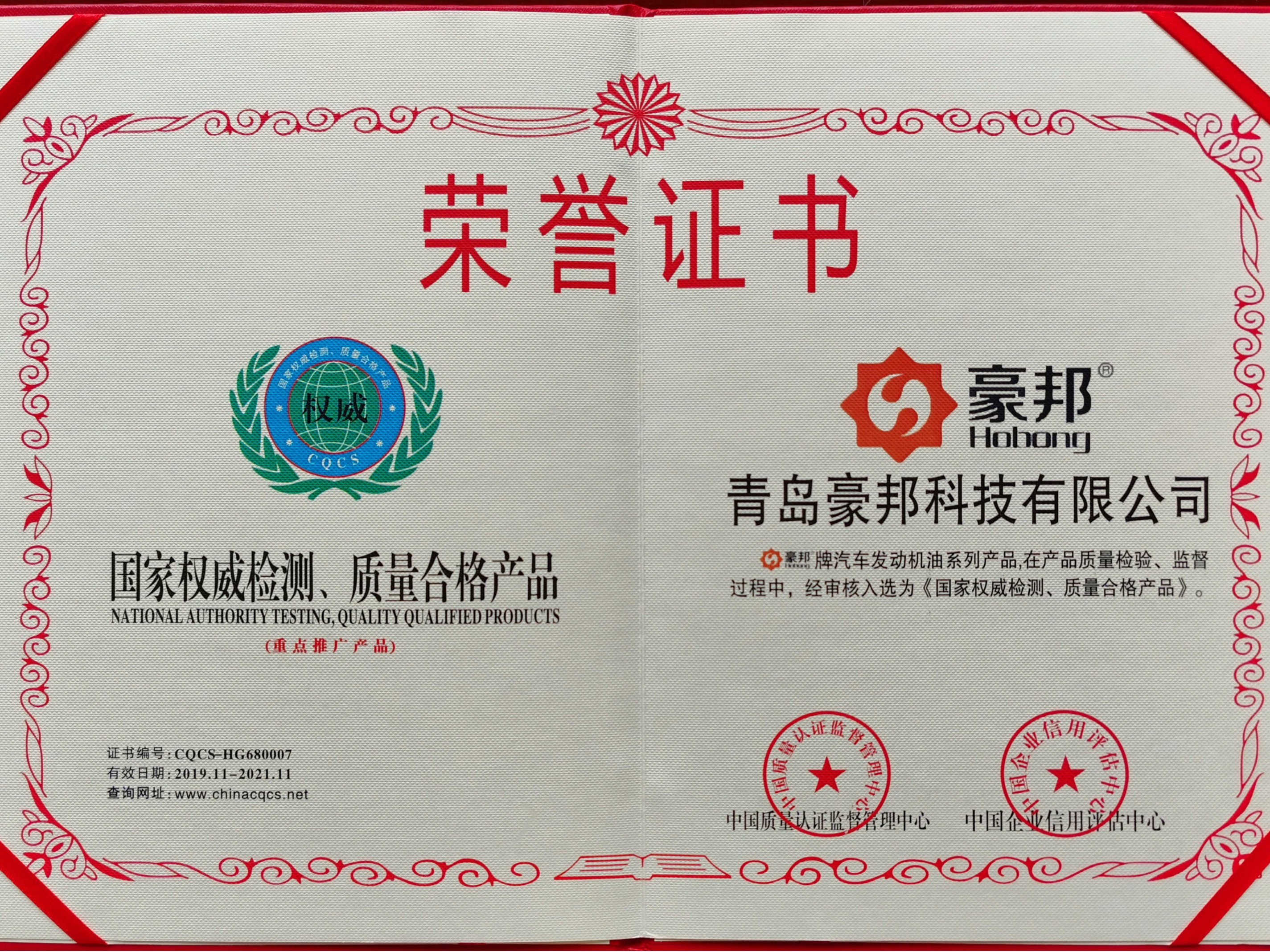 2019年11月,青島豪邦科技有限公司獲得中國質(zhì)量認(rèn)證監(jiān)督管理中心頒發(fā)的《國家權(quán)威檢測質(zhì)量合格產(chǎn)品》榮譽證書,證書編號:CQCS-HG680007。中國質(zhì)量認(rèn)證中心(CQC)是經(jīng)中央機構(gòu)編制委員會批準(zhǔn),由國家市場監(jiān)督管理總局設(shè)立,委托國家認(rèn)監(jiān)委管理的國家級認(rèn)證機構(gòu)。中國質(zhì)量認(rèn)證監(jiān)督管理中心通過對豪邦機油進(jìn)行嚴(yán)格的指......